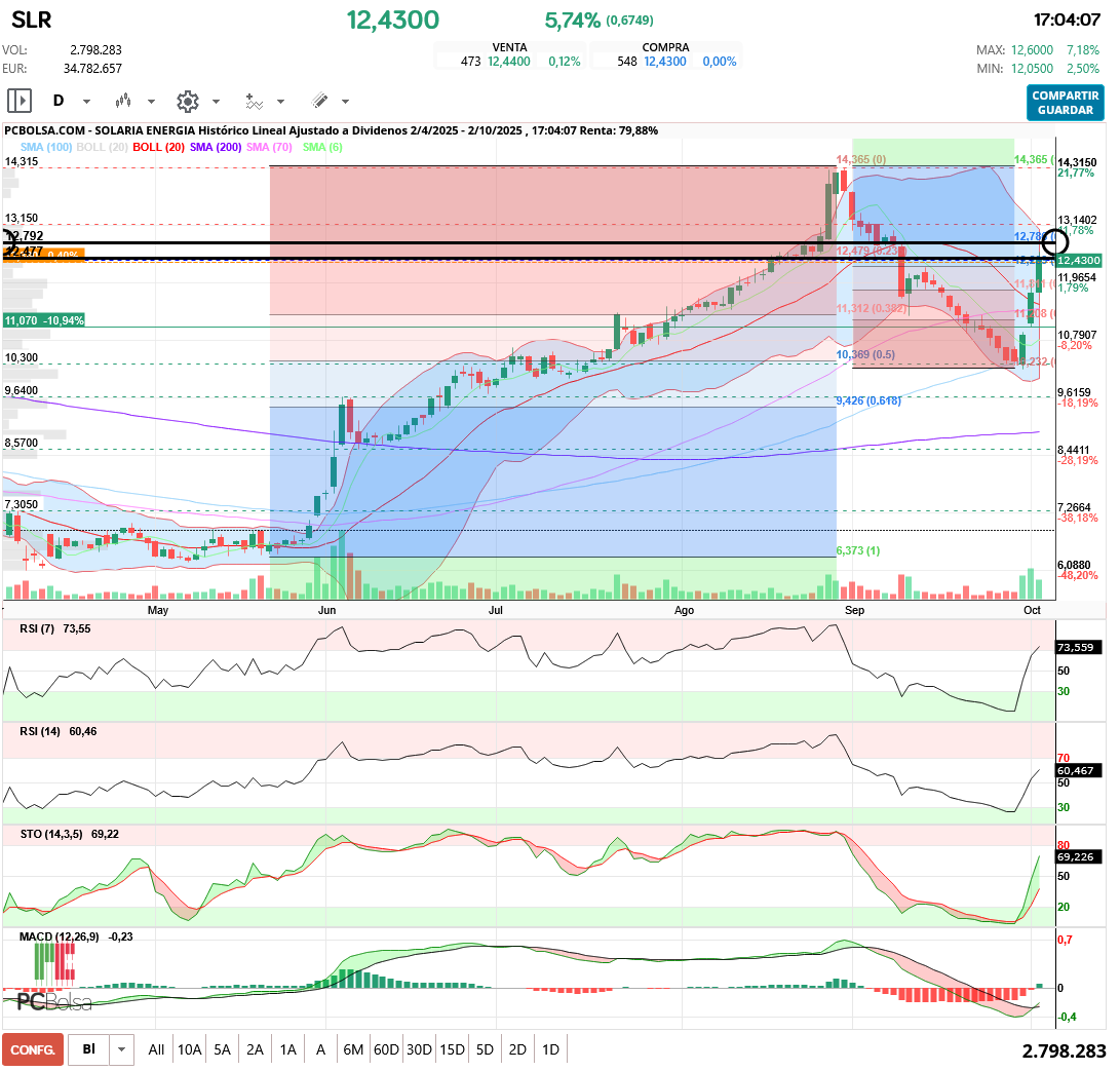 SOLARIA A 02-10-25: SI CIERRA POR ENCIMA 12,80 SUPERA FIBO BAJADA Y PODRIA SUBIR Y LUEGO ESO SERIA SOPORTO. SI BAJA DE 12,47 ES FIBO SUBIDA MUY MALA SEÑAL Y SI LO SUPERA PUES TAMBIEN PODRIA SER SOPORTE. YO COMPRARIA SI CIERRA POR ENCIMA 12,80, AUNQUE LA SUBIDA DE ESTOS DIAS FUE BASTANTE VERTICAL Y LO NORMAL ES QUE RELAJARA INDICADORES