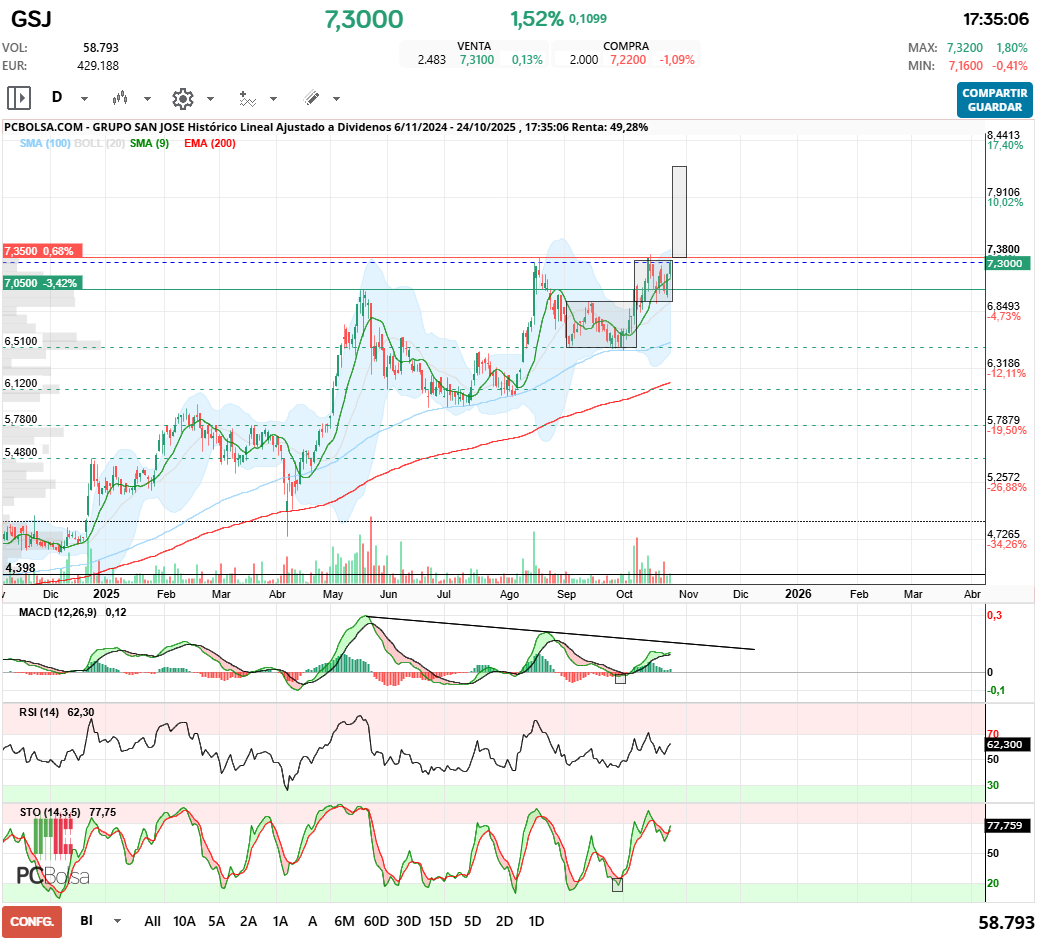 GSJ cumplió objetivo doble apoyo. Si supera 7,35 y logra mantenerse sobre esa cota, activa nuevo objetivo por figura (taza). Por poner un pero, divergencias en indicadores, que pueden ser anuladas.