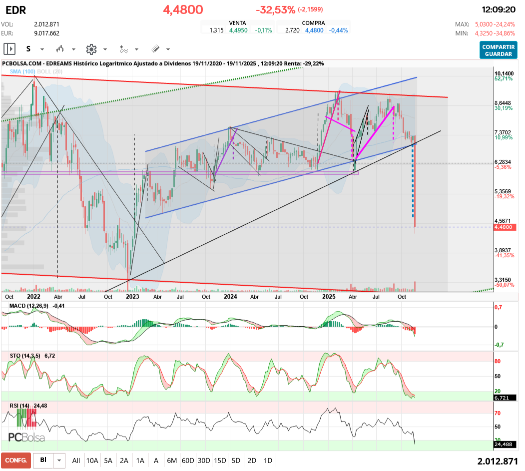Actualizo gráfico logarítmico. En la última actualización del 02/09/25 ya vimos como rompía a la baja una formación de cuña alcista y estando en ese momento a 8.47 marcaba objetivo de caida a 7.10, en lo que sería una búsqueda de la base del canal alcista (azul). Este mes se ha visto cumplido ese objetivo. Entre ayer y hoy se ha producido la ruptura de ese canal alcista, todo ha sido muy rápido y ha más que cumplido el objetivo de caida que estaba en 4.75. Para mí no debería caer mucho mas de esta zona. Ya vimos que en marzo se salió uno de los accionistas de referencia (Permira) y desde entonces no se han vuelto a superar los precios marcados por entonces. Lo de ahora parece que es reposicionamiento de carteras de los grandes accionistas. A ver cómo queda el gráfico cuando terminen.