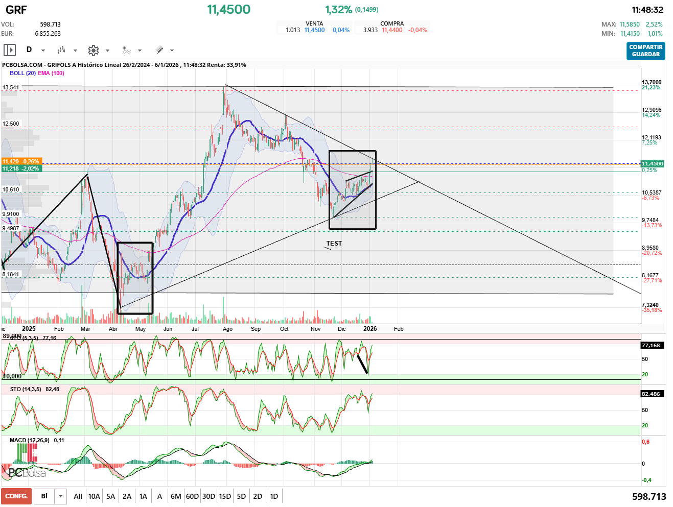 Rompió la cuña alcista ( las cuñas rompen en sentido opuesto a la tendencia) y la subida gano verticalidad ( fuerza ). Ahora toca romper la directriz bajista y la resistencia de 11,585 de 28 de octubre, de momento la ha tanteado. Espero que haga lo mismo que el rectángulo de mayo 2025