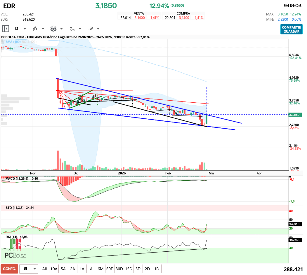 Actualizo gráfico logaritmico y vela diaria 26/02/26 Presenta una cuña descendente rota por arriba en la zona de 3.20. Proyección teórica a la zona de 4.50. El RSI muestra una divergencia alcista y el STK está rebotando desde zona sobreventa. Los astros se han alineado por fin, a ver si esta vez ya puede ser dejar esta zona absurda de cotización. S2