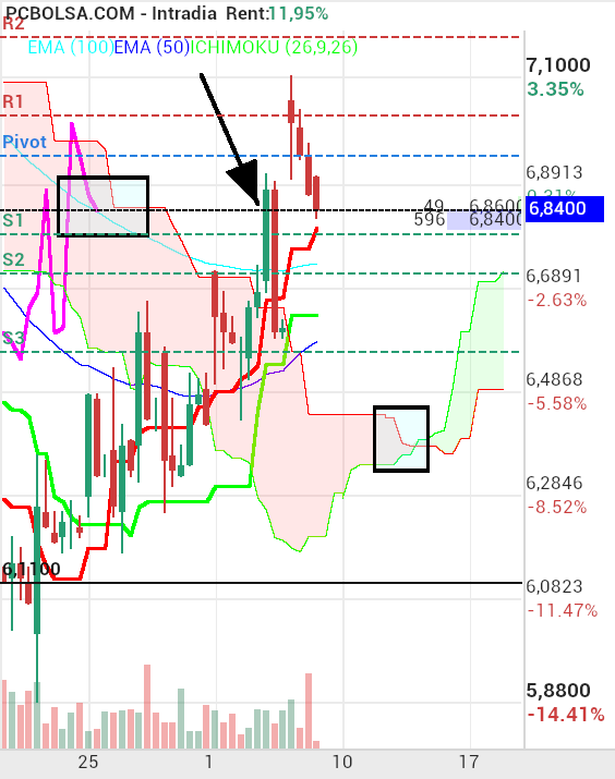 en Ichimoku.. ya ha hecho una vela verde limpia por encima de la Nube y ha habido cruce en la.misma... solo queda que la retrasada también cruce la nube para dar más fuerza a la señal de compra de la vela.. en gráfico diario la retrasada está a muy poco de ir por encima del precio ( señal de compra también.. ) a ver si sigue hacia arriba los siguientes días. :)