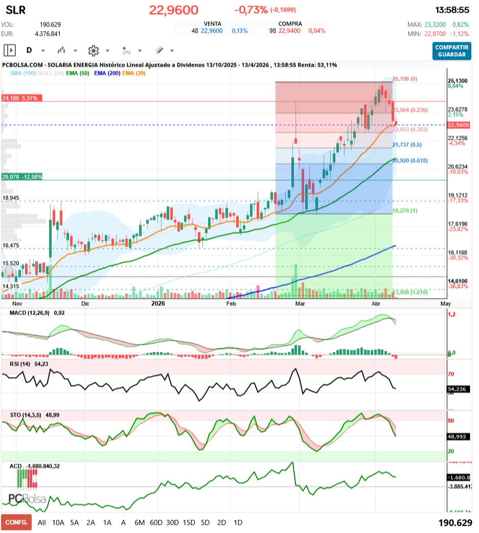 Tramos de Fibo desde la última subida. Coincide con la EMA20 en diario en 22,90