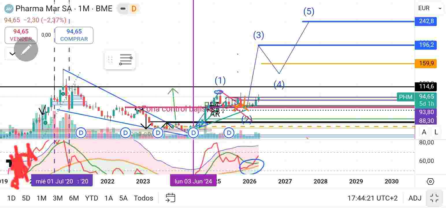 el mismo gráfico sin tocar desde los 30e..solo sw quitan lineas secundarias cumplidas, como podéis observar e tdi mensual finalmente giró en su soporte como se esperaba cuando llegó a el y se comentó , en teoria debe buscar y atacar la parte alta de las bb , llevando al precio a la zona 120-140 antes de corregir.