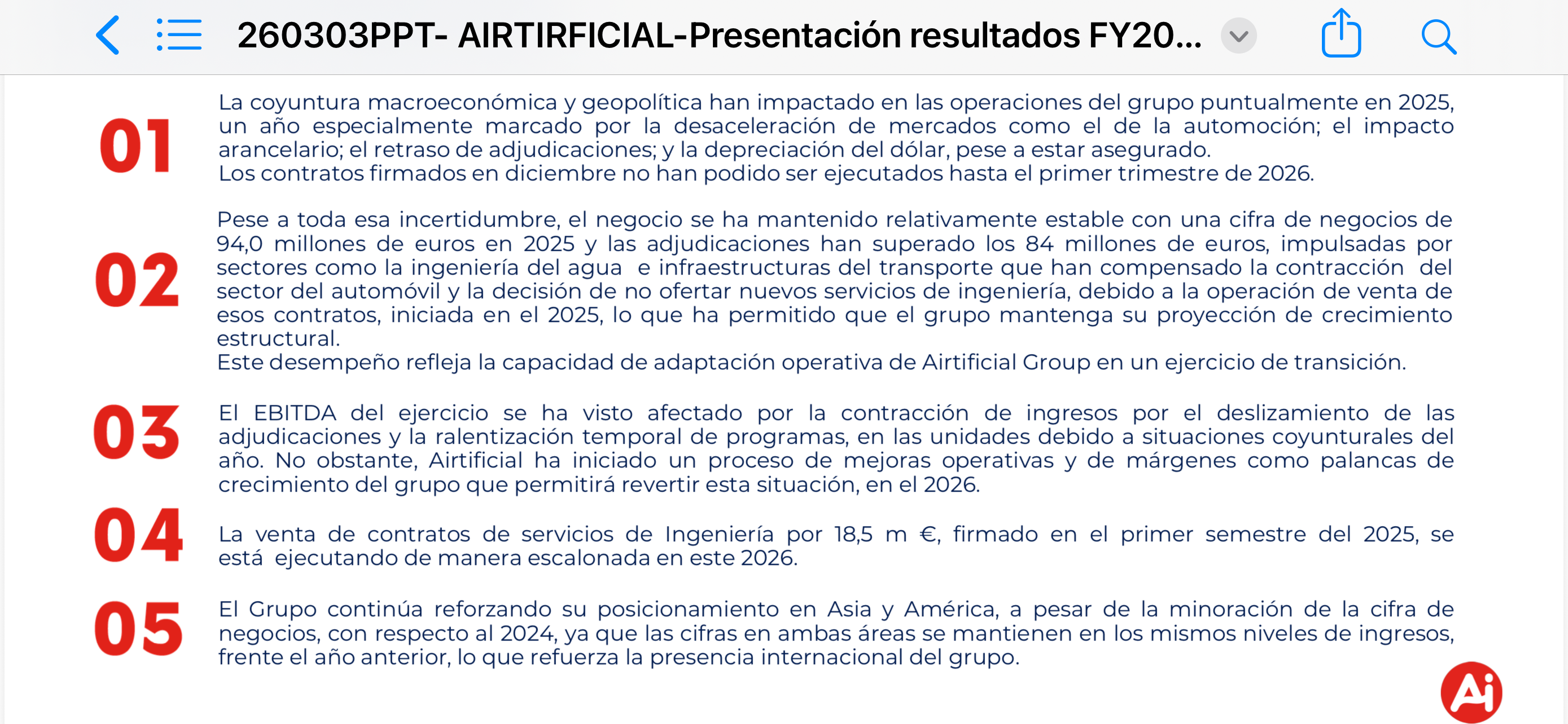 Airtificial es una nueva compañía tecnológica, española y especializada en la aplicación de inteligencia artificial, mediante robótica colaborativa, estructuras sensorizadas y desarrollos de ingeniería, en los tres sectores en los que opera: obra civil, aeronáutica y automoción. Una compañía que nace en la Industria 4.0. con un "know-how" contrastado y presencia en los principales mercados: Europa, Estados Unidos, Latinoamérica y Asia.