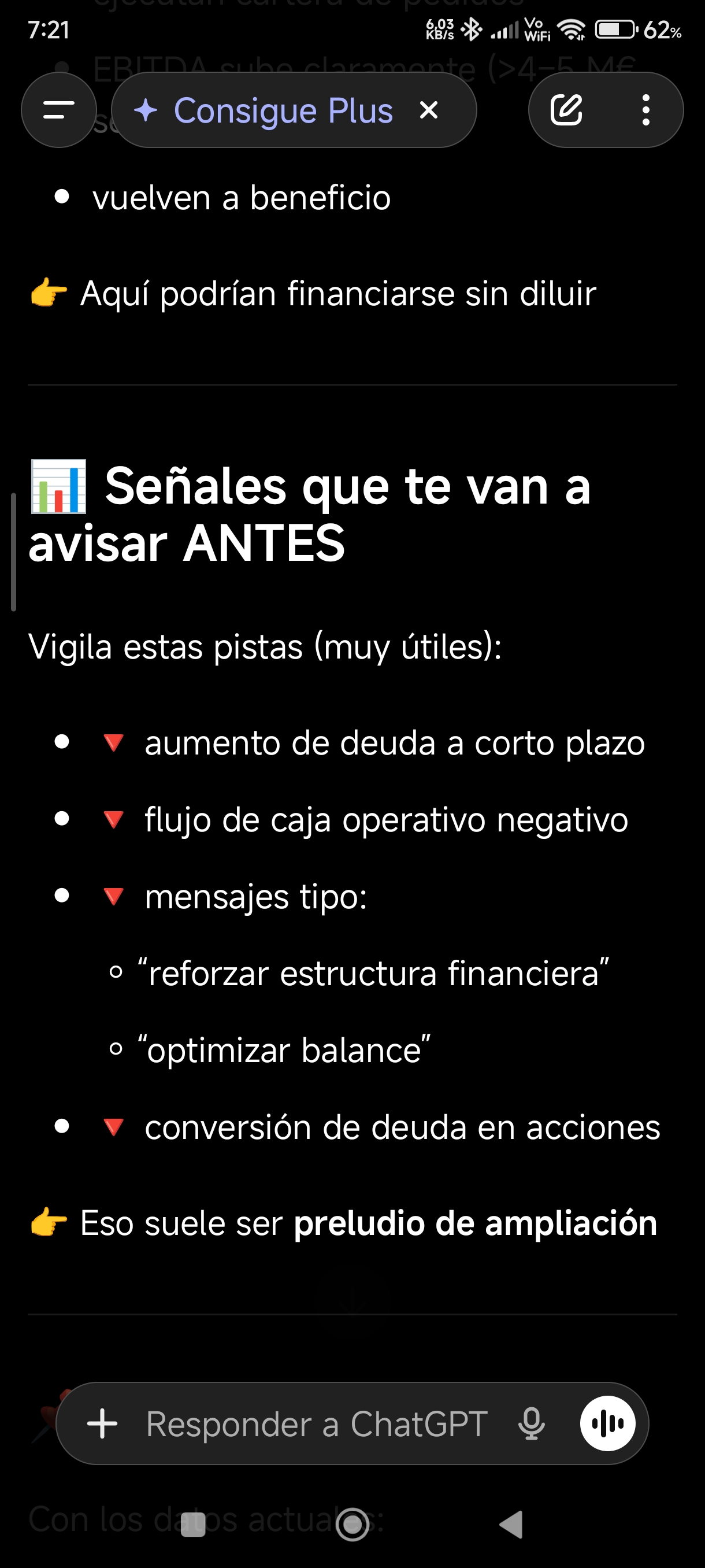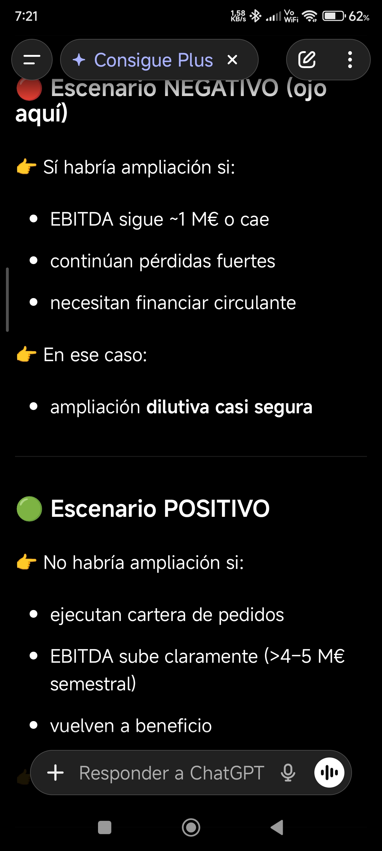 No comento los resultados porque no merece la pena. De acuerdo totalmente con Manurro, ya que , por la tendencia que lleva en este año, o la salvan de nuevo los socios con una una ak, garantizada por ellos, o concurso de acreedores. De los socios depende que esto siga a delante. Ellos deciden.