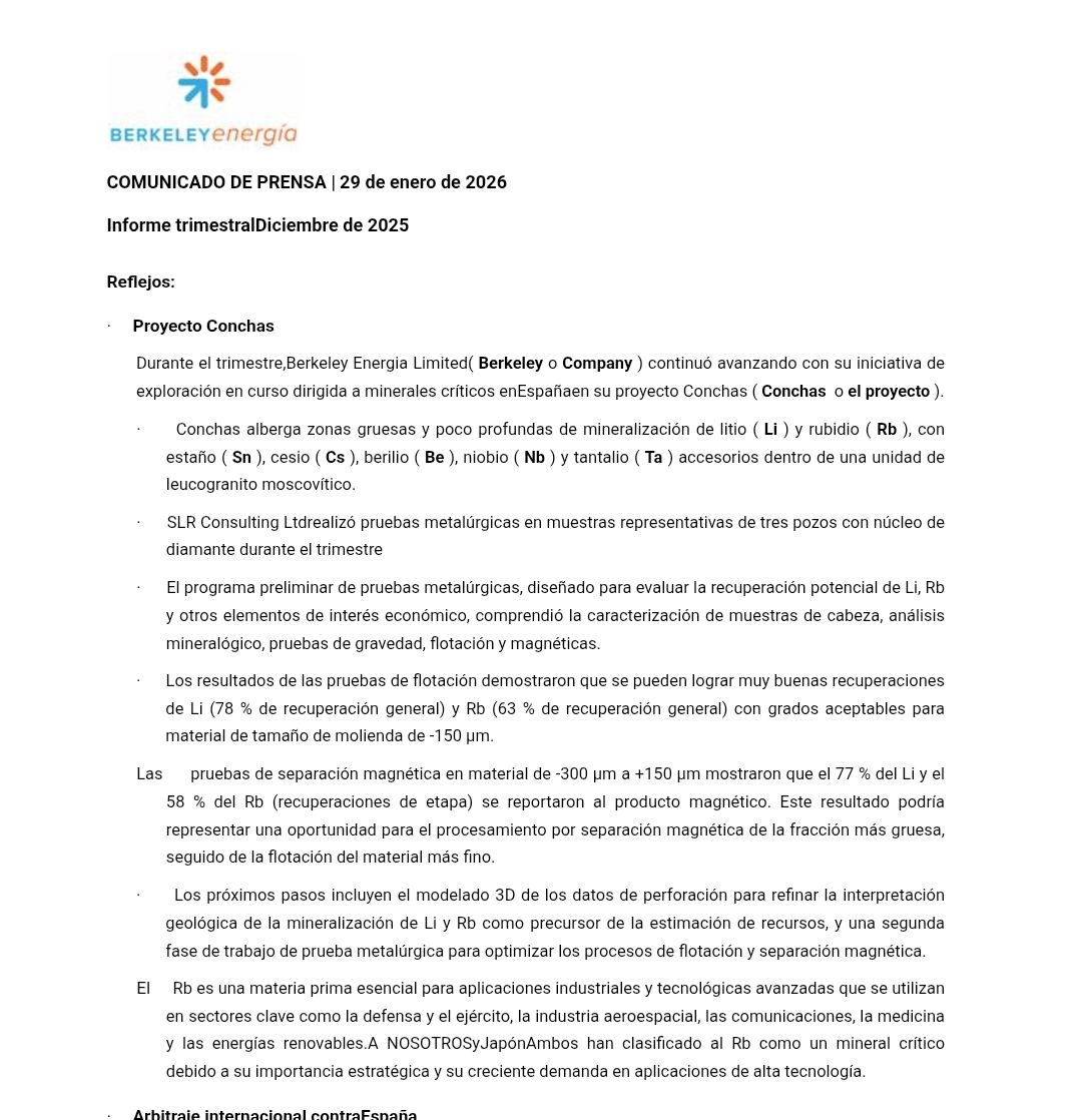 CNMV Links Berkeley Energia