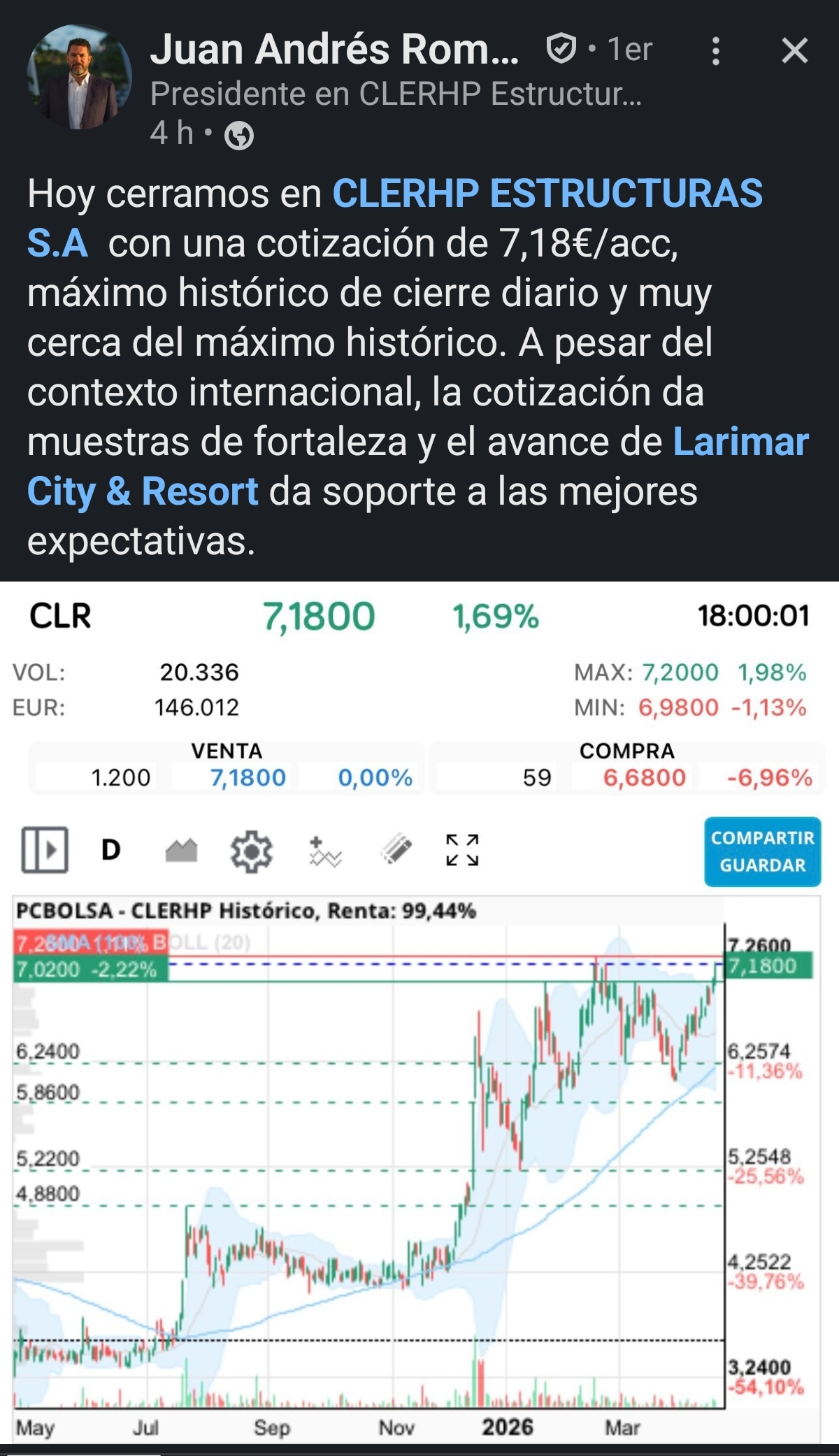 En cuanto a la posible valoración de la empresa, flujos de caja, precio de la acción. En la entrevista que realizó JA con José Javier González hace unos meses, rápidamente a groso modo se puede hacer un cálculo del valor. Total de M2 a construir, valor del mismo, nº de acciones se puede hacer un cálculo. Ojo siempre que se realicen todas las fases y no se reparta dividendo o recompra de acciones. En el minuto 14 lo comentan, para recordar.