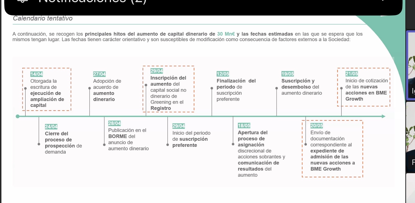 Tienes toda la información en los documentos públicos de GREENING dentro del BUSINESS PLAN. Fecha de canje 30 abril. Fecha acciones cotizando con la AK de 30 millones suscrita 20 mayo