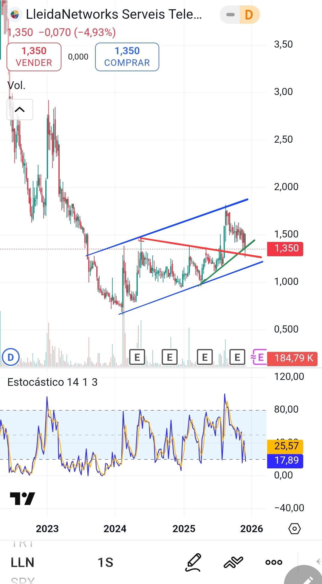 Así estás por AT en semanal. Perforada la directriz acelerada (color verde), tendremos que esperar a ver si la rompe o solo ha sido una dilatación. De todas formas, queda la posibilidad de que sirva de soporte la línea clavicular de agotamiento en la tendencia de medio plazo (línea roja). El estocástico en zona de fuerte sobreventa. De todas las opciones se está inclinando por la más negativa, pese a la recompra de acciones que debería de haber actuado de soporte en la zona de 1.50 euros, por lo menos. Queda el consuelo de que de los resultados que dé en el 4Q los ratios dan una fuerte infravaloración. La clave estará en que el 4Q deje ver una mejora en el negocio, aunque no repercuta mucho en el anual.