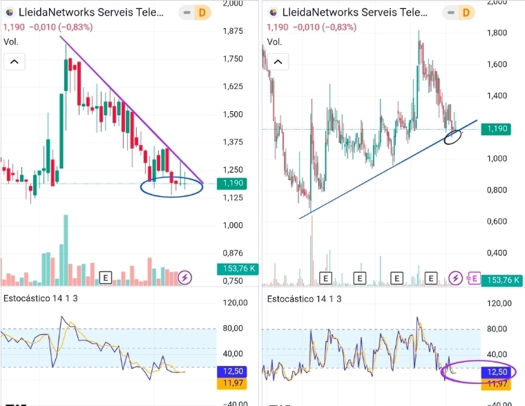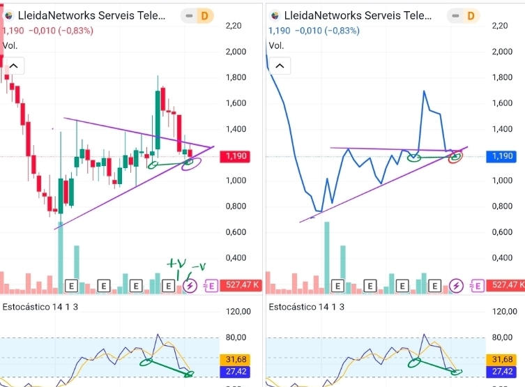 En semanal, más o menos lo mismo. Aquí me he centrado en la directriz que corrige el movimiento porque es significativa. Tanto el volumen como la forma tan milimétrica de controlarla nos hace pensar que alguien fuerte está detrás. Además, está claro el sinsentido: corregir 62 céntimos sin noticia negativa, al contrario, tanto beneficio como deudas y negocio evolucionan favorablemente. El negocio se estanca, pero vemos cómo está manteniendo buenos contratos, consiguiendo otros como el de ascensores o Marruecos, e incrementando los clientes de forma recurrente y espera mantener este crecimiento. El estocástico lo tiene desde hace unas semanas en zona de sobreventa extrema. En cualquier momento se puede decidir por ir a buscar la sobrecompra.
