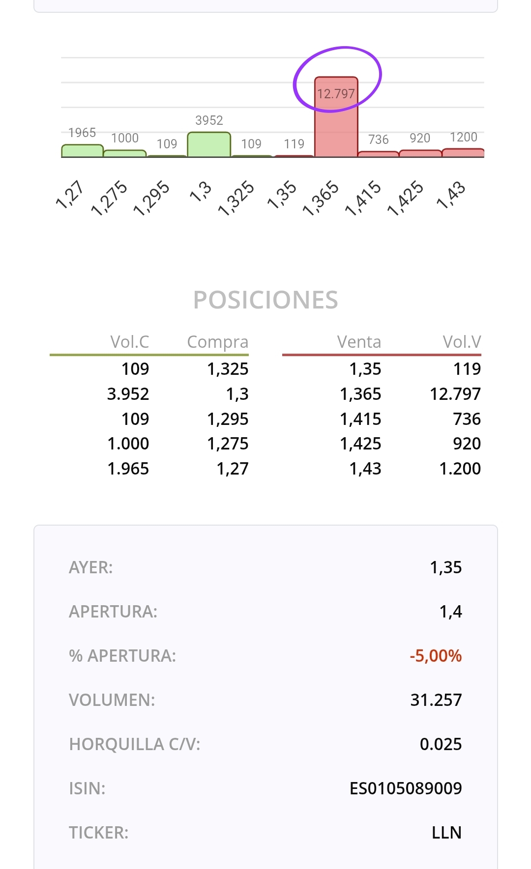 Buenas tardes, parece que se sale uno ayer nos dejó las 42000 y pico y tiene prisa para que las viéramos, yo creo que ya remata hoy la faena seguramente sean la 12000 en 1,36 las últimas y claro detrás va la borregada con cuatro duros y remata la faena, cierra la ?? al salir.