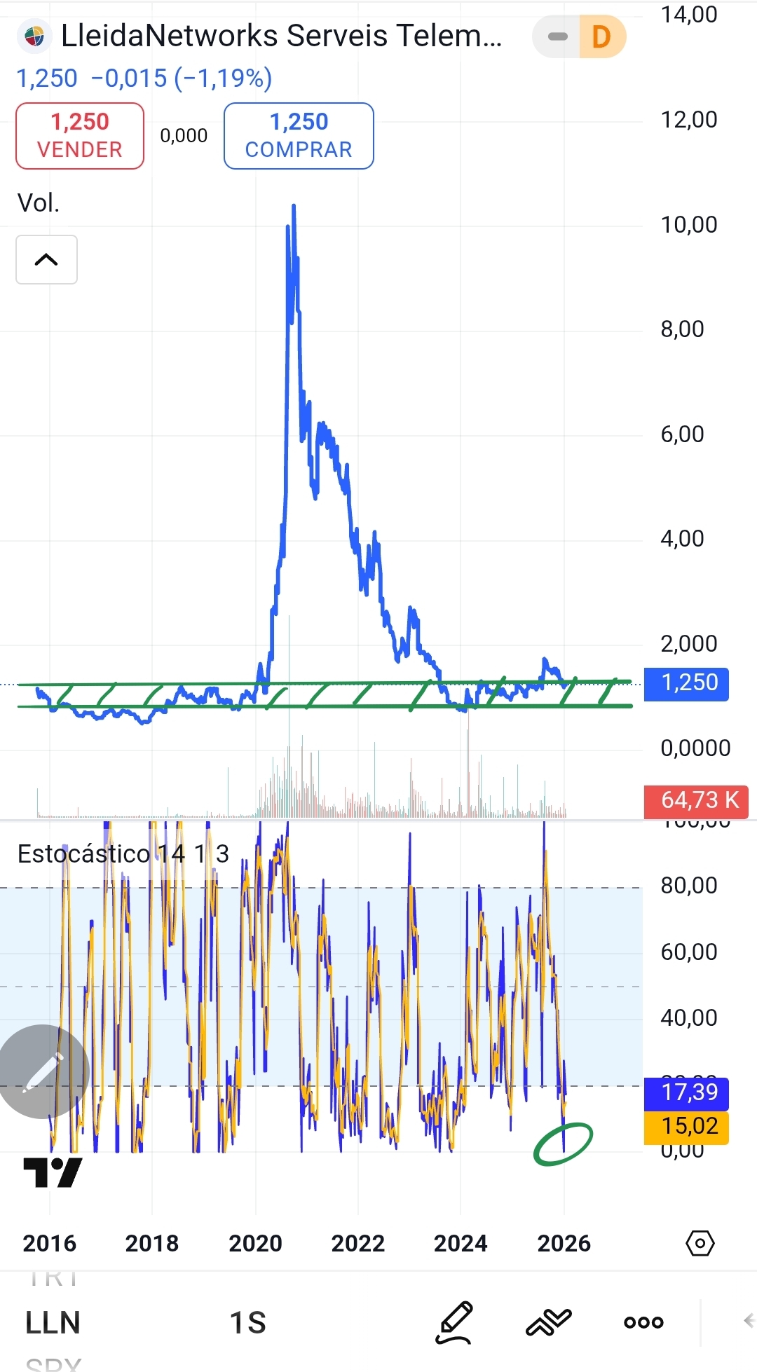 Por técnico, la zona de 1.15 a 1.20 debería ser un soporte muy fuerte, atendiendo a la zona de congestión histórica. Sin más, no veo el precio por debajo de esos valores; más aún, no debería haber bajado de 1.50 euros. Y lo mismo que cuando sube sin fundamentos al final termina rectificando, cuando baja sin fundamentos deberá recuperar esos precios. Pero parece que hasta que no veamos nuevas noticias sobre negocio y beneficios, los inversores no tomarán decisiones.