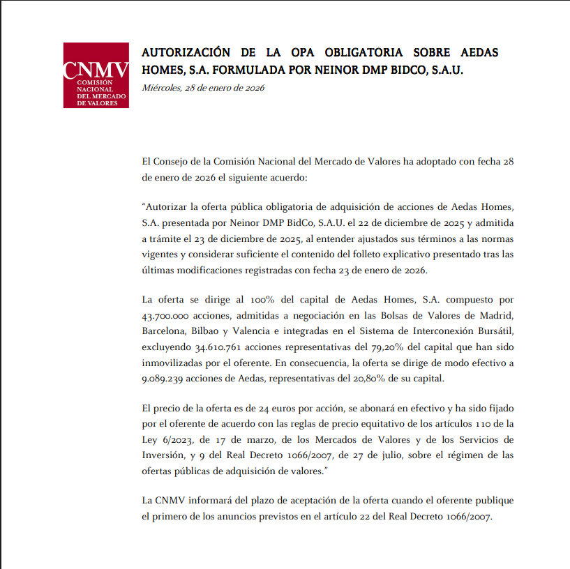 El plazo para ir a la OPA de los accionistas de AEDAS va desde el 30 de enero hasta el 27 de febrero ambos inclusive.
