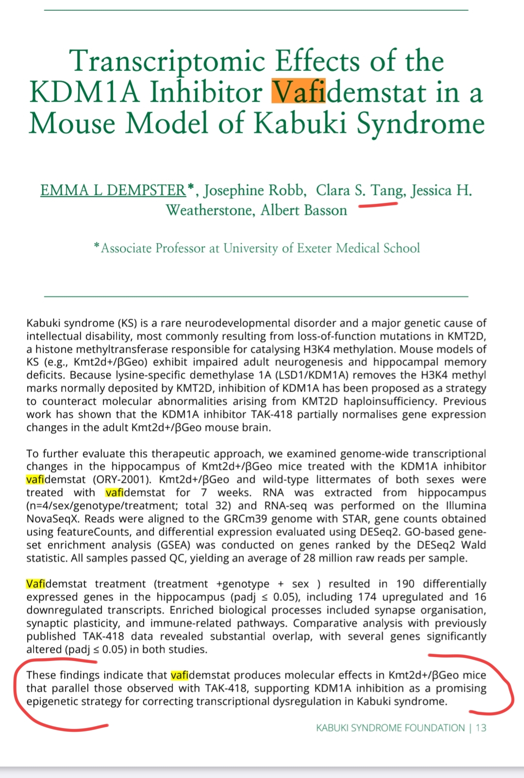 Vafidemstat is an LSD1 inhibitor. A similar compound has been shown to improve learning in a mouse model of Kabuki syndrome. Outcomes of this study are expected in 2026 and will help guide our decision to pursue a $5 million fundraising effort in support of a vafidemstat clinical trial.