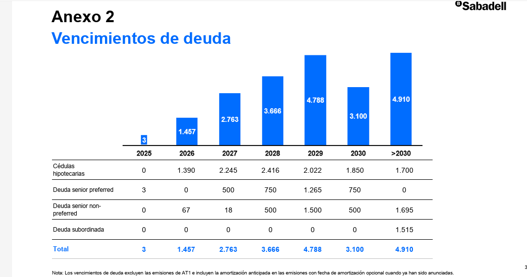 Leídos los resultados del Sabadell, aparte de que en el trimestral comparado gana menos, me ha llamado la atención el anexo de la página 34. No sé qué conclusiones sacáis, pero los vencimientos de deuda parecen hechos para haber pagado los dividendos en lugar del crecimiento de la entidad