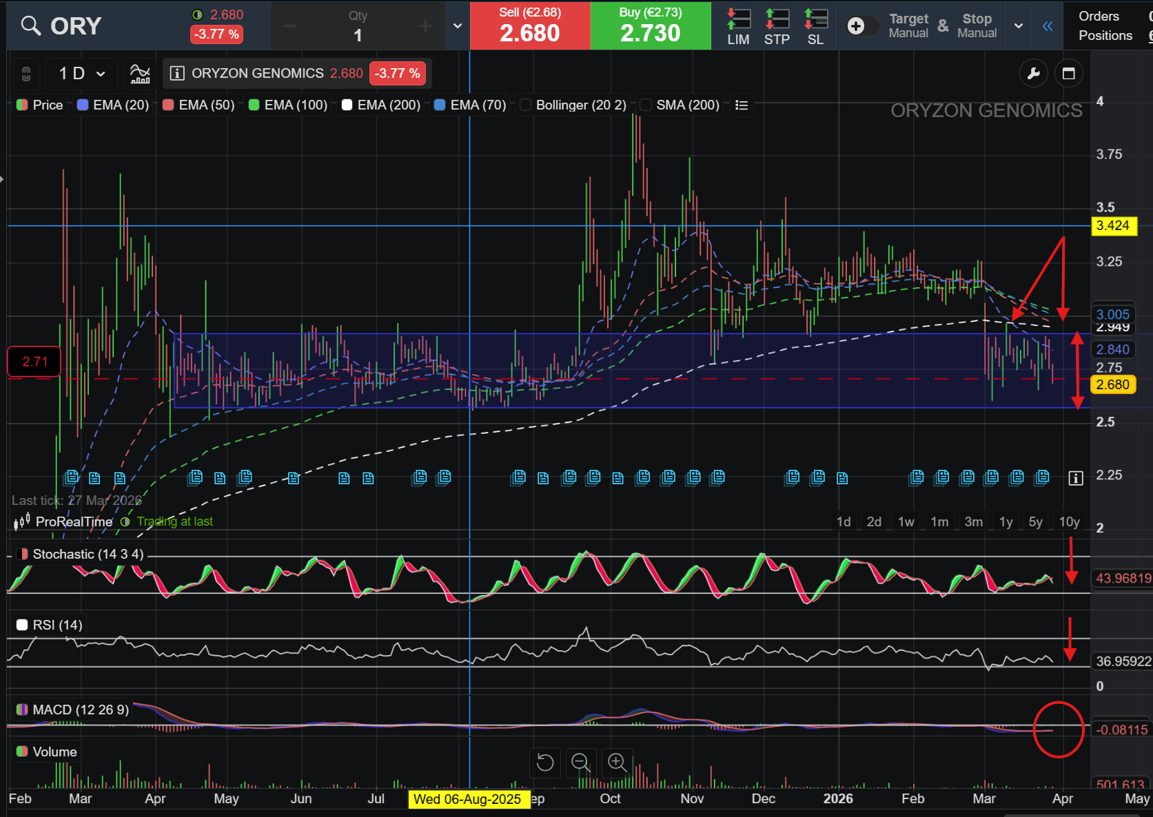 Las medias están todas giradas a la baja, con el cruce de la EMA20 sobre la EMA200, lo que indica tendencia bajista.