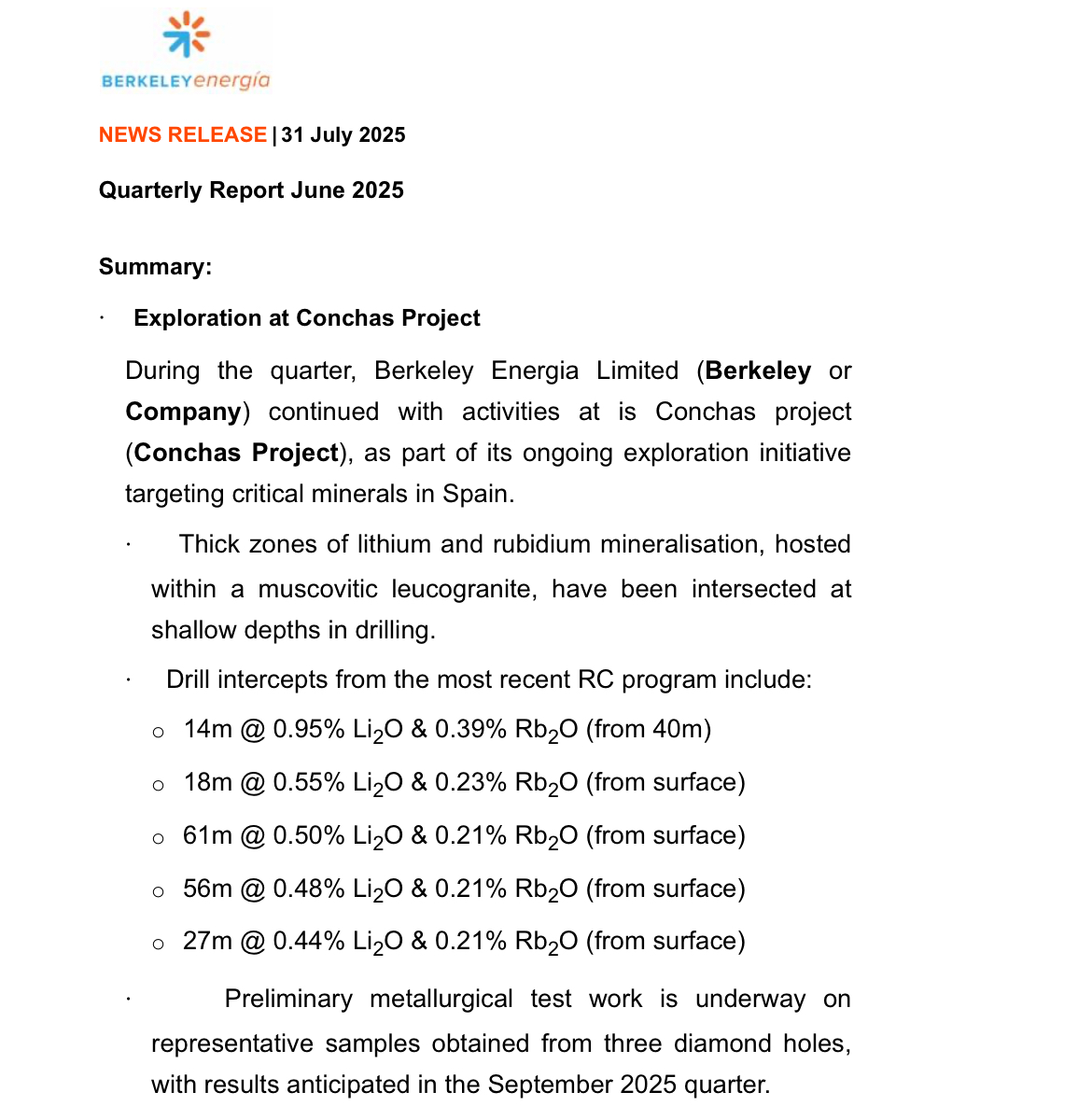 Preliminary metallurgical test work is underway on representative samples obtained from three diamond holes, with results anticipated in the September 2025 quarter.