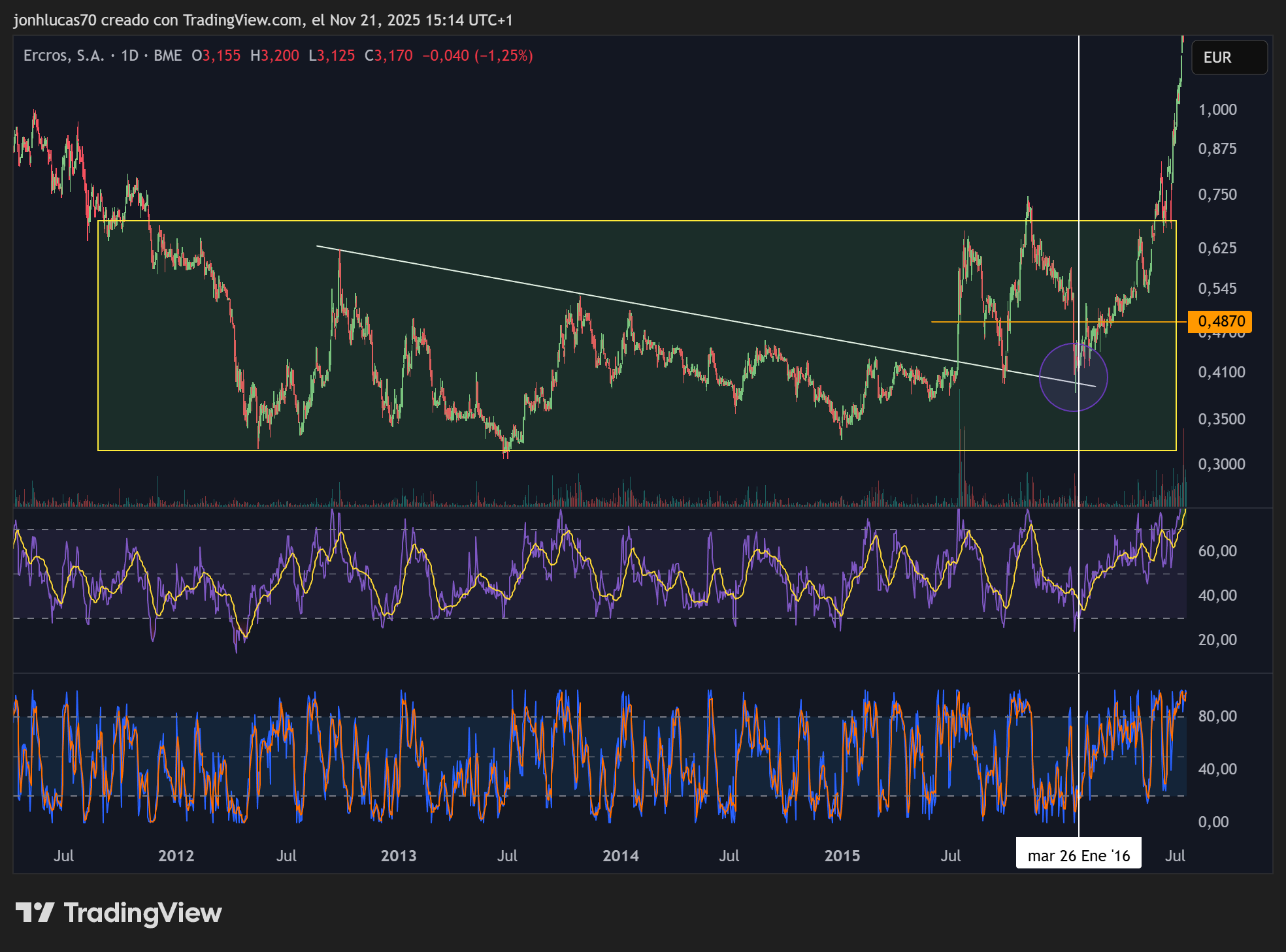 Rango lateral gigante, con absorción final con cuña sobre soportes con implicaciones alcistas y divergencias alcistas. Fase C completada, LPS clavado, mostrando fuerza oculta, aunque parezca debilidad, es fuerza. Gráfico y fundamentales totalmente alineados