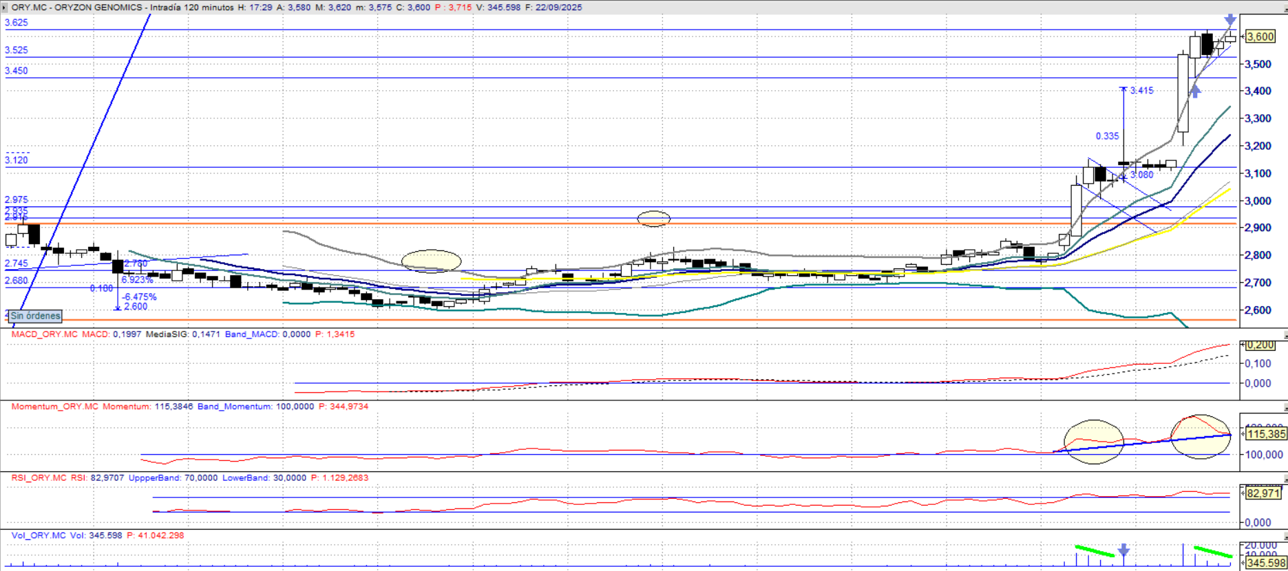 Si nos fijamos, vulneró la bollinger superior, y ahí se ha frenado una vez colocada dentro, en intradia primera resistencia. Si hacen las cosas bien, y rompen con VOLUMEN el paño de esta bandera, la proyección nos lleva a los 4 euros. Creo que vulnerando el último fibo, debería corregir el 100% eso es, situarnos en la zona de 3.69, que implicaría la superación del paño de la bandera/gallardete comentado anteriormente y por tanto, se debería vulnerar. Hay algo detrás que desconocemos, pero hay posicionamiento evidente de "alguien" y se le suman operadores intradia, con lo que es una buen cóctel. Como siempre he dicho, puede que alguna noticia esté al caer, y si este es el escenario, con estas subidas se está descontando, por tanto, cuando salga, "ojo avizor".