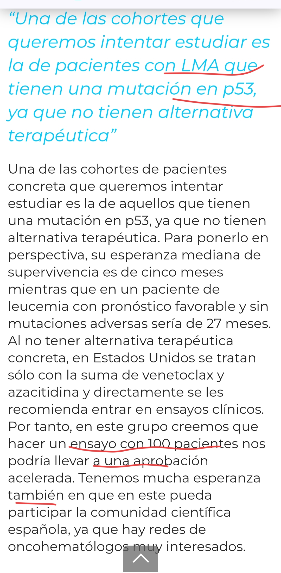 Lo más cerca que tenemos con Iada es un aprobado acelerado de la FDA con unos 100 pacientes con la triple combinación LMA ,..así dijo buesa el otro día ..después de los datos finales en fin de año . ..se arrancará una fase II/III y con 100 pacientees esperan