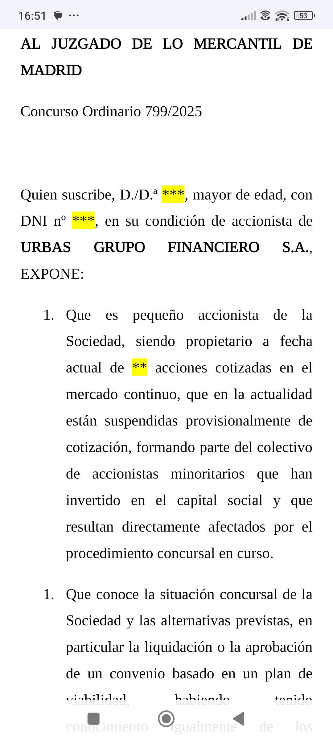 Esto me han respondido esta mañana desde la empresa: Con motivo del proceso concursal en curso de URBAS GRUPO FINANCIERO, S.A., estamos recabando el apoyo de accionistas minoritarios al Plan de Viabilidad y a la Propuesta de Convenio presentados por la compañía.