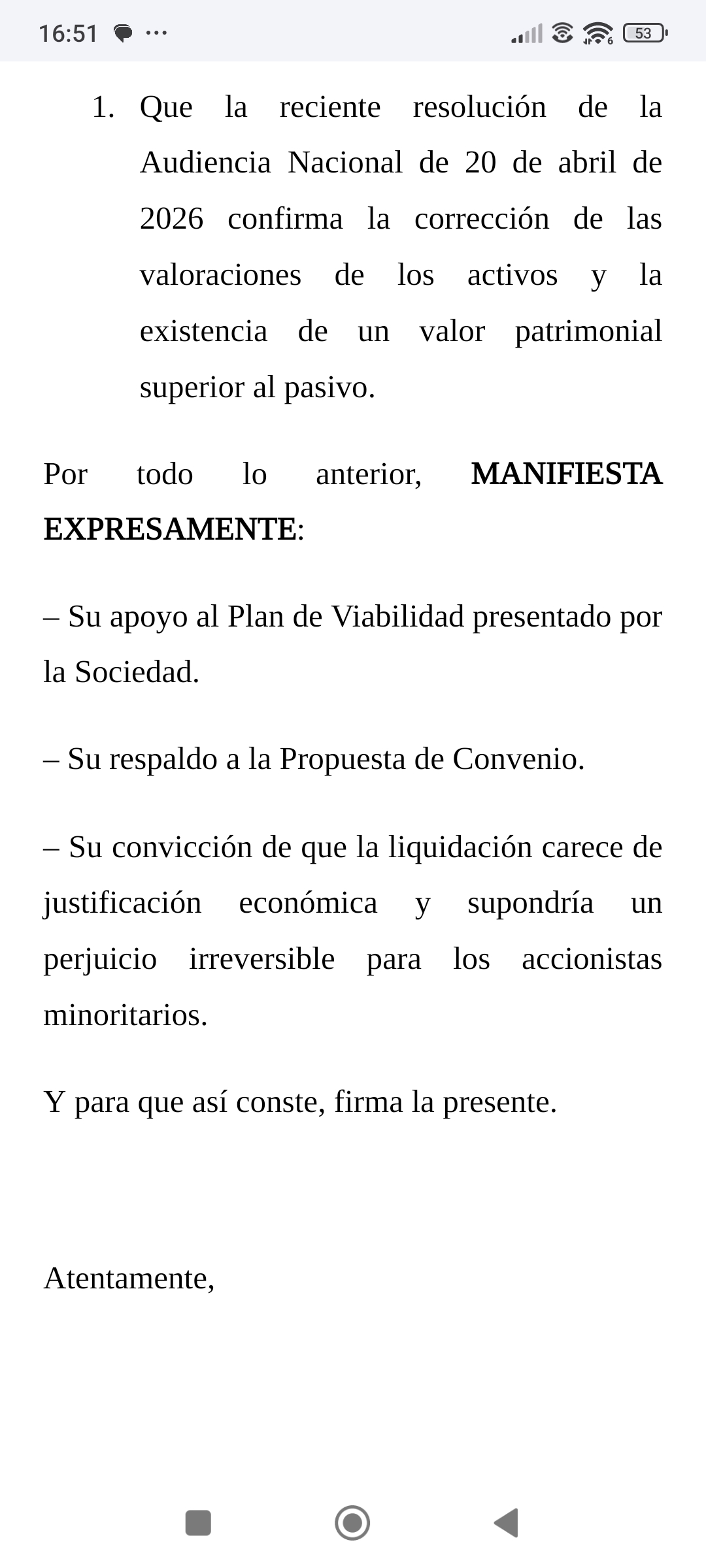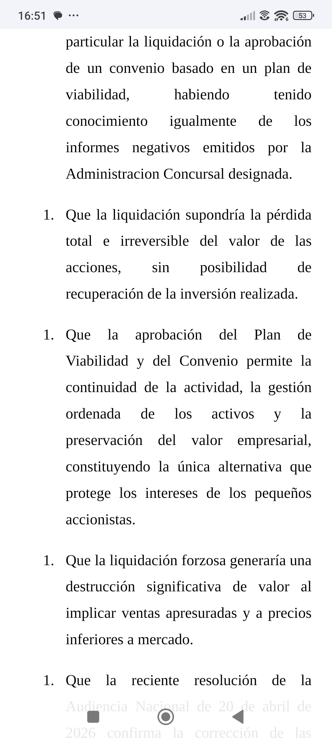 Les solicité el plan de viabilidad, pero no me lo han enviado, me respondieron esto a otras cuestiones: Respecto al Plan de Viabilidad, la compañía se encuentra actualmente en fase de desinversiones y coordinación dentro del procedimiento concursal, por lo que los detalles concretos sobre su ejecución, incluyendo otras posibles medidas, se irán comunicando a medida que se vayan formalizando y, en su caso, aprobando en el marco legal correspondiente.
