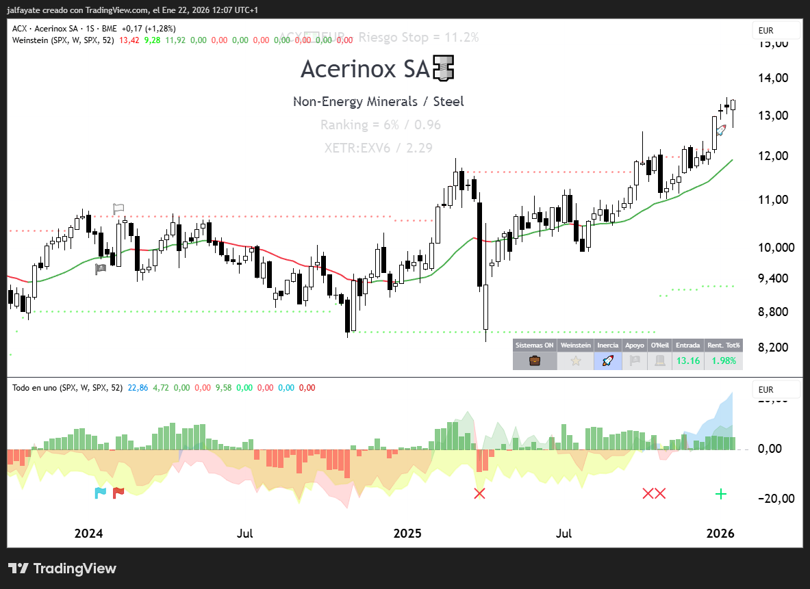 Otra que coge potencia en el movimiento es Acerinox. mira el histograma de fuerza del subsector (en azul). Esa fortaleza en sector y en valor es lo que nos gusta cuando estamos en un valor. ¿14€ primera zona de resistencia?