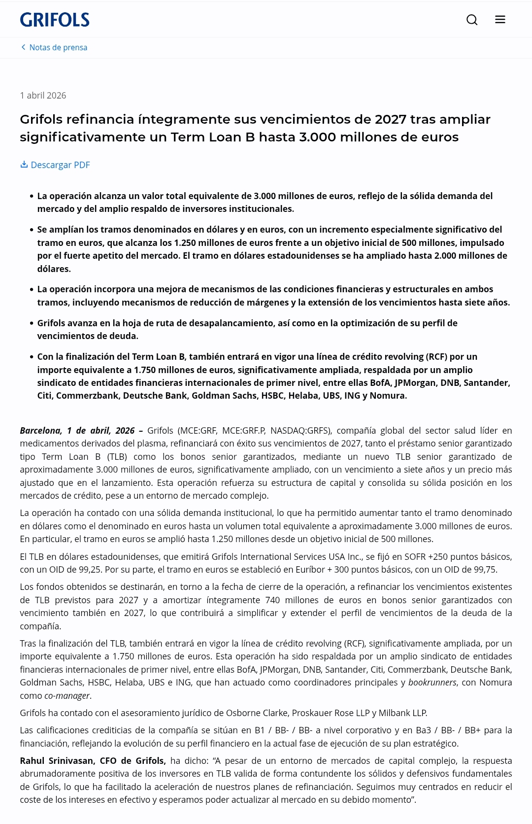 Los Accionistas Anónimos de Grifols celebramos la refinanciación y vemos que las últimas noticias favorables pueden actuar de contrapeso contra el descuento por gobernanza que arrastramos hace tiempo y que en septiembre 2025 volvió a estallar con el "paso atrás" de la nueva Comiión Estratégica formada por 5 miembros 3 Scranton.