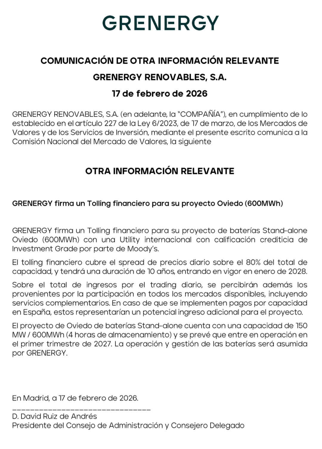 OIR de GRENERGY. La operación y gestión de baterías será asumida por GRENERGY.