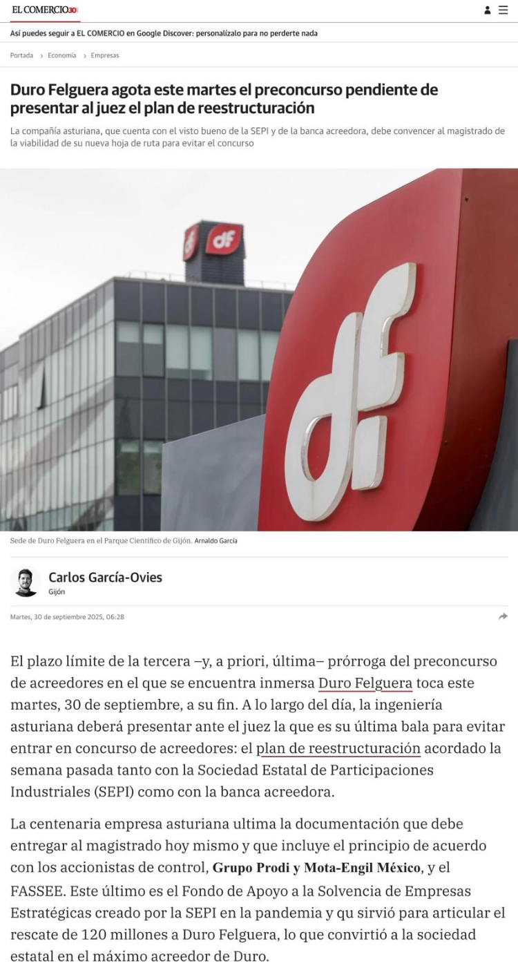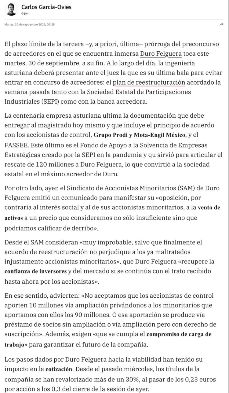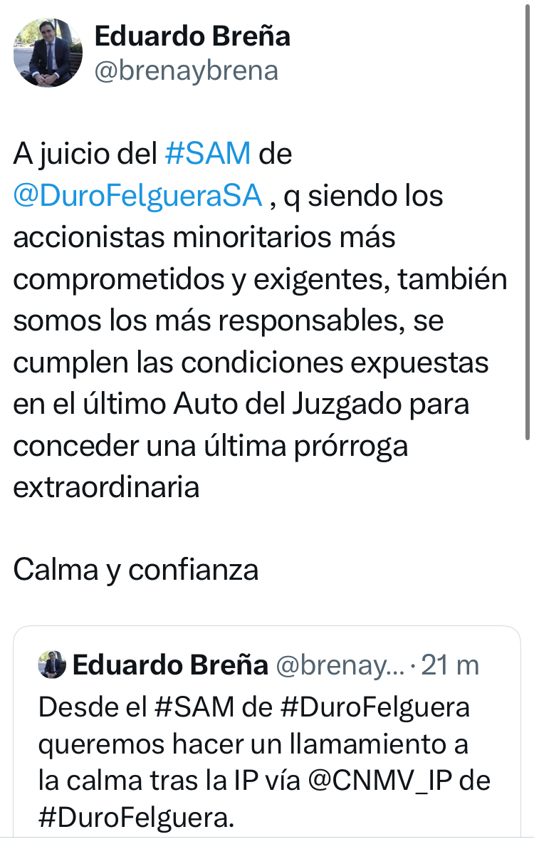 Buenos días. De momento hay aún motivos fundados para pensar en positivo sobre el futuro de Duro. El Sr. Juez, no iba a conceder más prórrogas si no veía motivos suficientes relativos a su reestructuración, plan estratégico y renegociación de acreedores. La nueva prórroga no la hubiera dado si no hubiera visto motivos razonables para su recuperación y viabilidad; fue muy oportuno que llamásemos a la calma, pues se cumplen las condiciones para la concesión de una última prórroga extraordinaria.